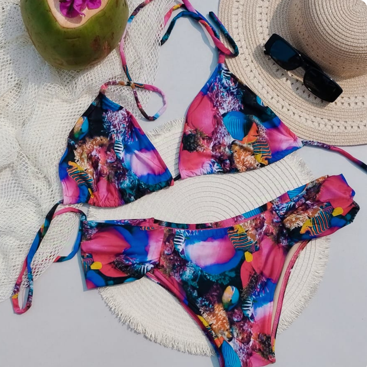 Biquini com parte superior estilo cortininha com opção de bojo removivel.